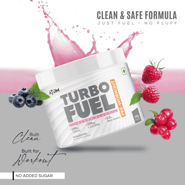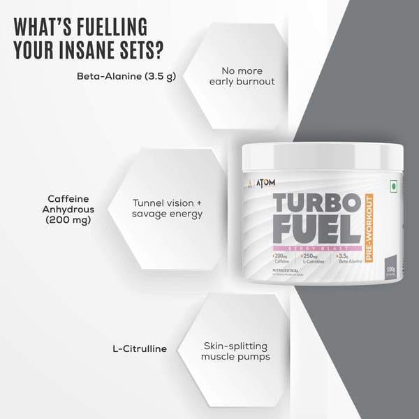 ATOM Turbo Fuel is a precision-formulated pre-workout designed for serious athletes and fitness enthusiasts who train with purpose. Packed with clinically dosed ingredients like Beta-Alanine (3.5g) for enhanced stamina, Caffeine Anhydrous (200mg) combined with L-Theanine and Theobromine for focused, crash-free energy, and L-Citrulline (4.3g) for powerful muscle pumps and improved endurance, it helps you push harder and recover faster. L-Carnitine (200mg) supports fat metabolism and muscle recovery, making it ideal for both cutting and bulking phases. With a clean label, no banned substances, and no fillers, ATOM Turbo Fuel delivers real results without the hype. Just one scoop mixed with water before your workout powers your performance with lasting energy, sharper focus, and greater resilience so you can train harder, recover smarter, and show up stronger every time.