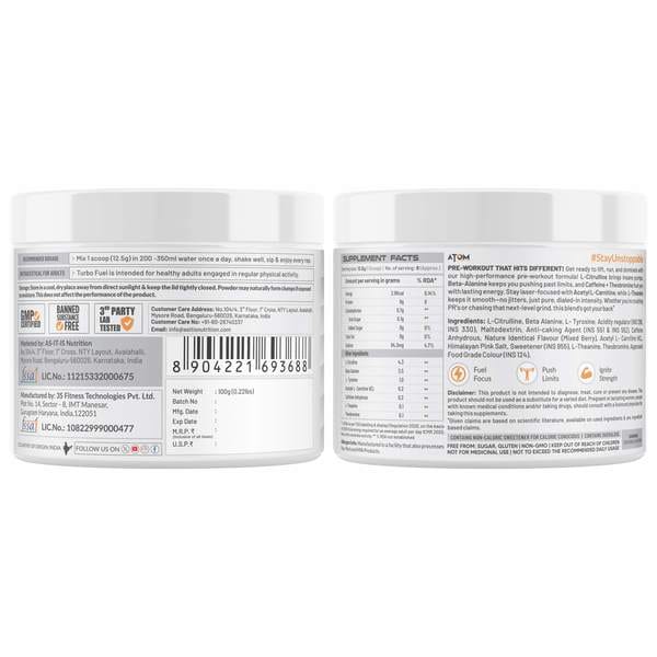 AS-IT-IS ATOM TURBO FUEL 100gms I Pre-Workout Formula I 200mg Caffeine, 4.3g Citrulline, 3.5g Beta Alanine I Energy, Strength, Focus & Muscle Pump Support I 8 Servings, Berry Blast Flavour