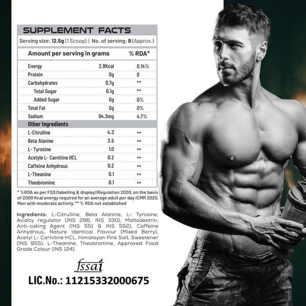 - Ingredients: Supplement with L-Citrulline, Beta Alanine, Caffeine, L-Tyrosine, sweeteners, flavors, and additives; made in a facility processing soy, nuts, and milk.