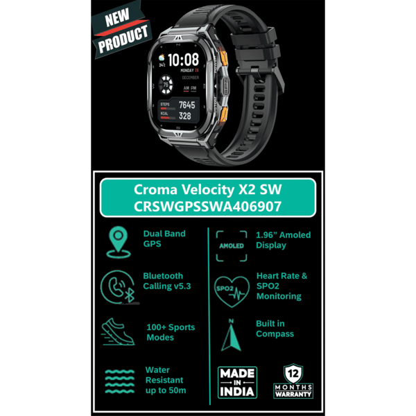 Croma - A Tata Product Velocity X2 Smart Watch 7 days Battery Life AMOLED Display, Dual Band GPS, Built in Compass, Multiple Sports Mode, SPO2 Monitor, Heart Rate Bluetooth Calling (Black)