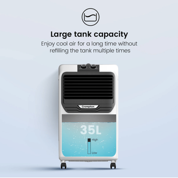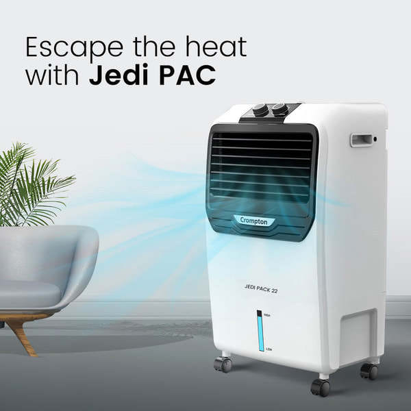 Crompton Jedi PAC 22 Personal Air Coolerwith water tank capacity (upto brim) of 22 L; Suitable for 140 sq. ft. room size. Cooling Performance: Blower with Air Delivery of 1200 m3/hr; Ice Chamber is available; Cooling Medium is High Density Honeycomb pad that to provides superior & prolonged cooling for hours. Engineered with everlast pump, the Jedi PAC 22 air cooler copes up with high-level TDS & jam to ensure durability & smooth working. 4-way air deflection allowing you to adjust air stream direction according to your convenience. Crompton coolers requires only 130 watts and can be run on inverter power. Dimensions of coolers: 400 x 290 x 765 mm Cooler is manual, No remote control is present.