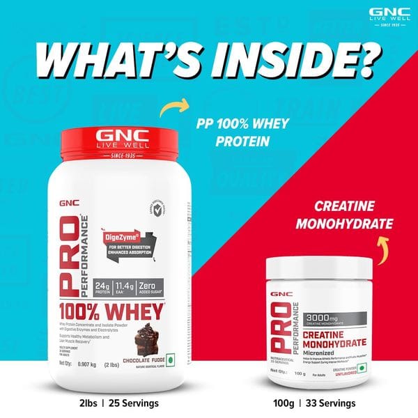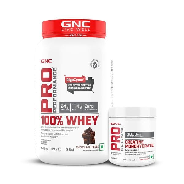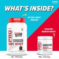 GNC Pro Performance 100% Whey Chocolate Fudge + Creatine Monohydrate Combo - Builds Lean Muscles | Promotes Faster Recovery | Boosts Athletic Performance | Hydrates Muscle Cells | 2lbs / 100gm Combo