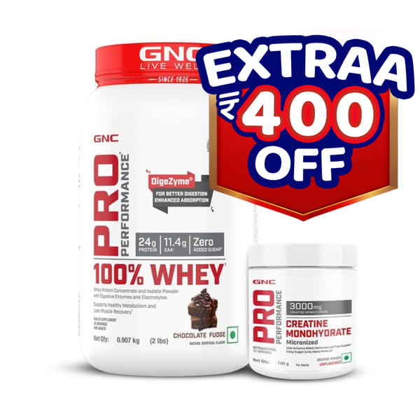 Race up towards your fitness goals with our GNC Pro Performance 100% Whey Protein and Creatine Monohydrate Combo. Formulated to be 100% pure, GNC's high-quality whey effectively energises the body and improves your endurance. In addition, it is instantized to promote easy absorption and better metabolism. Each scoop contains 24gms of concentrated protein, which effectively takes care of your daily protein needs. Plus, the formula has 5.5gms of BCAAs that help build lean muscles and reduce muscle cramps & fatigue during your super-active workout sessions. It's also packed with 9 essential amino acids that expedite muscle recovery. GNC Pro Performance Creatine Monohydrate promotes faster energy production to energize you during heavy workout sessions. It improves your athletic performance and stamina remarkably. This formula hydrates your muscle cells to volumize your muscles and give them a hulking appearance.