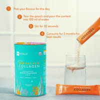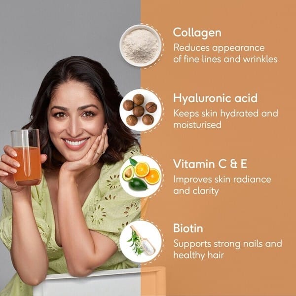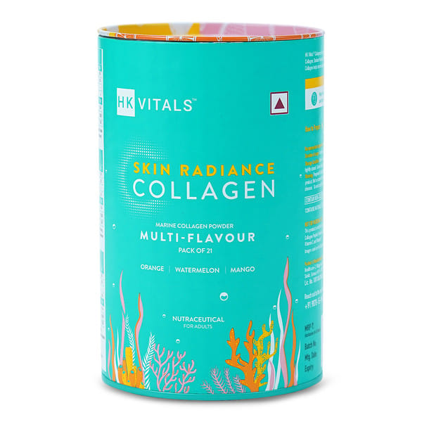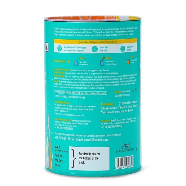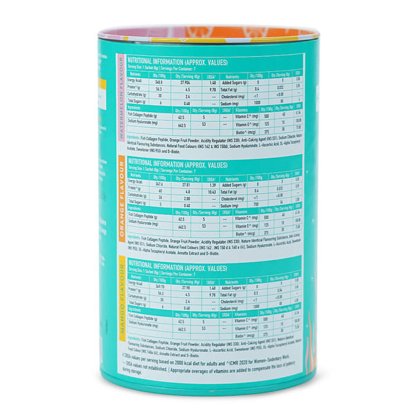 Watermelon Flavour: Fish Collagen Peptide, Orange Fruit Powder, Acidity Regulator (INS 330), Anti-Caking Agent (INS 551), Sodium Chloride, Nature Identical Flavouring Substances, Natural Food Colours (INS 162 & INS 150d), Sodium Hyaluronate, L-Ascorbic Acid, DL-Alpha Tocopheryl Acetate, Sweetener (INS 955) and D-Biotin. Orange Flavour: Fish Collagen Peptide, Orange Fruit Powder, Acidity Regulator (INS 330), Nature Identical Flavouring Substance, Anti-Caking Agent (INS 551), Sodium Chloride, Natural Food Colours [INS 162, INS 150 d & 160 a (ii)], Sodium Hyaluronate, L-Ascorbic Acid, Sweetener (INS 955), DL-Alpha Tocopheryl Acetate, Annatto Extract and D-Biotin. Mango Flavour: Fish Collagen Peptide, Orange Fruit Powder, Acidity Regulator (INS 330), Anti-Caking Agent (INS 551), Nature Identical Flavouring Substances, Sodium Chloride, Sodium Hyaluronate, L-Ascorbic Acid, Sweetener (INS 955), DL-Alpha Tocopheryl Acetate, Natural Food Colour [INS 160a (ii)], Annatto Extract and D-Biotin.