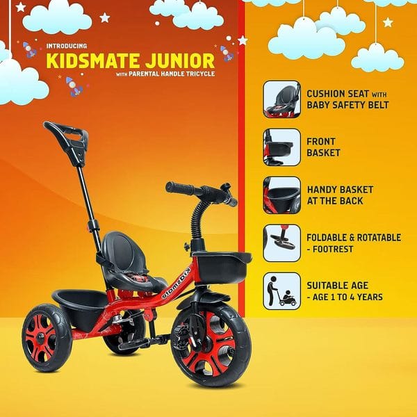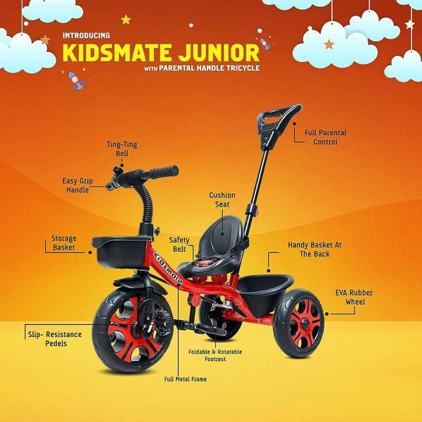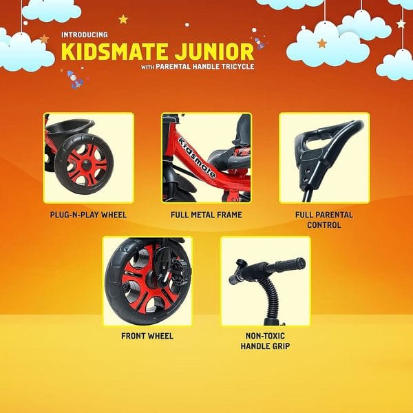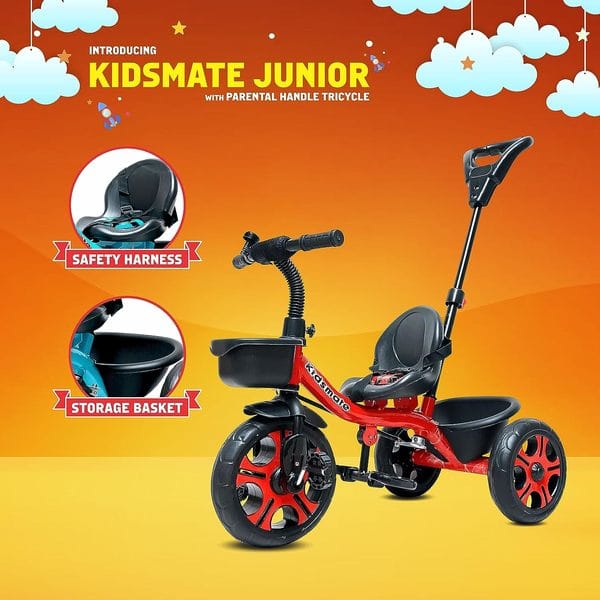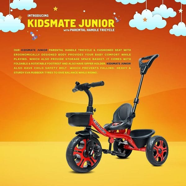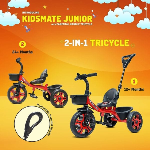 Kidsmate Junior Plug N Play Kids/Baby Tricycle with Parental Control, Storage Basket, Cushion Seat and Seat Belt for 12 Months to 48 Months Boys/Girls/Carrying capacityupto30Kgs