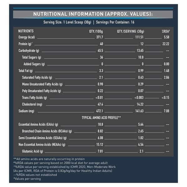 Ingredients: Skimmed Milk Powder, Whey Protein Concentrate, Cocoa Powder, Litesse (Polydextrose, Nature Identical Flavouring Substances, Stabilizer (INS 415), Emulsifier (INS 322 (i)), Sweetener (INS 955) & Anticaking agent (INS 551).