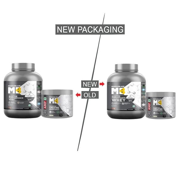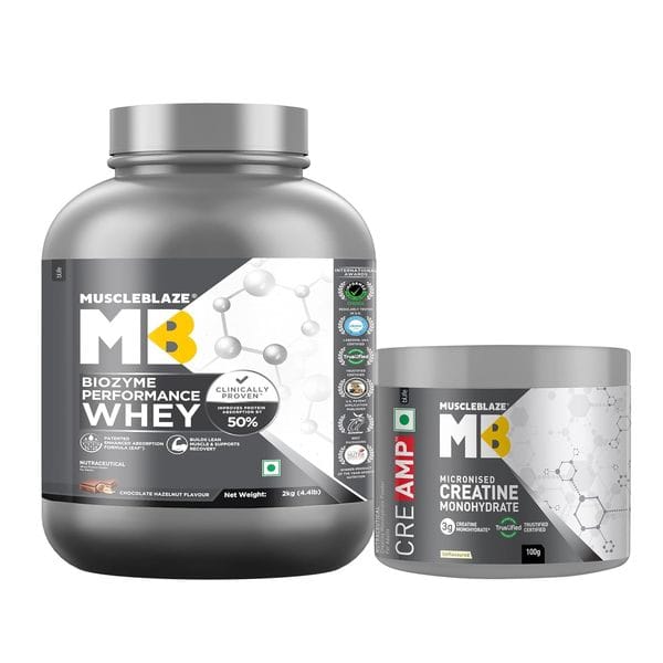 MuscleBlaze Biozyme Performance Whey Protein (Chocolate Hazelnut, 2kg / 4.4lbs) & Creatine Monohydrate CreAMP (100g, Unflavoured)