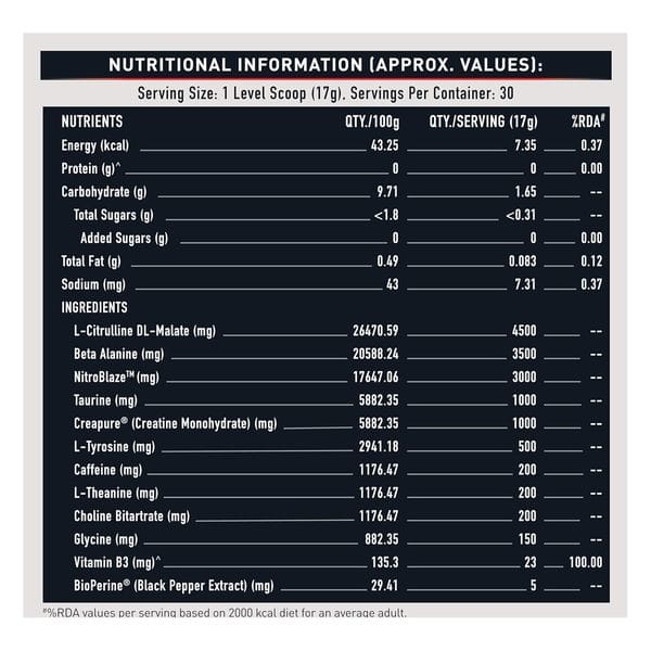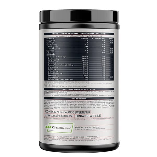 Ingredients: L-Citrulline DL-Malate (2:1), Beta Alanine, L-Arginine, Creapure (Creatine Monohydrate), Taurine, Myo-Inositol, Pineapple Fruit Solids, L-Tyrosine, Natural Flavouring Substance, Maltodextrin, Nature Identical Flavouring Substance, Anticaking Agents (INS 552 & INS 551), Caffeine {Caffeine Anhydrous & Micro Encapsulated Caffeine (NEWCAFFTM)}, L-Theanine, Choline Bitartrate, Sweetener (INS 955), Glycine, Acidity Regulator (INS 330), Vitamin B3 (Niacinamide), BioPerine (Black Pepper Extract) & Food Colour (INS 133).