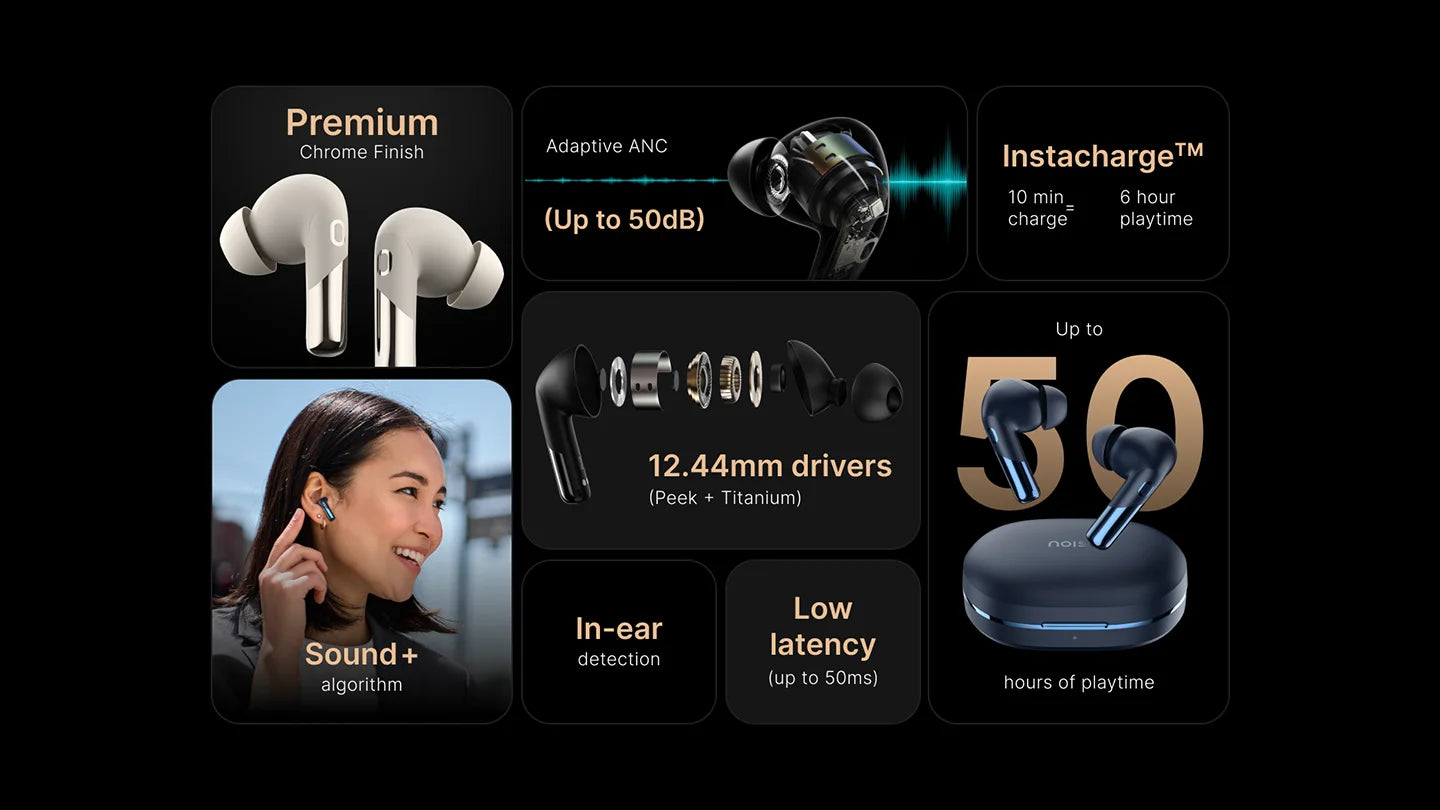 A premium chrome finish, 12.4mm PEEK + Titanium drivers, and Adaptive ANC (50dB) ensure an immersive audio journey.