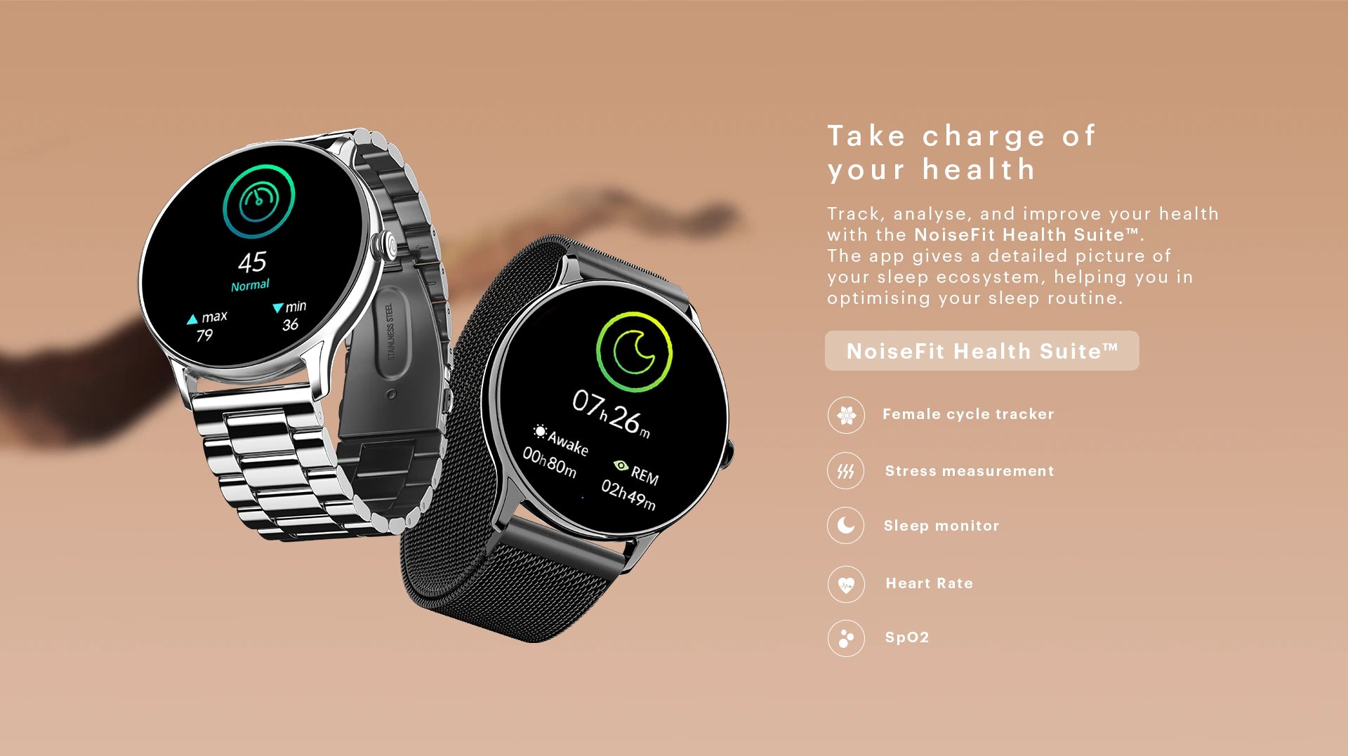 - Features: Heart rate monitor, SpO2 monitor, Step tracker, Activity history, Sleep monitor, Breathe practice, Stress measurement, Female cycle tracker