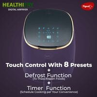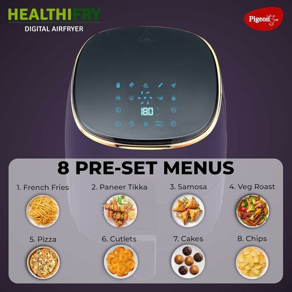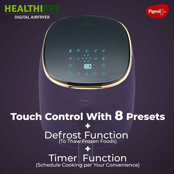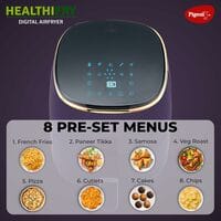 The Pigeon Healthifry+ 1400 W air fryer lets you enjoy your favorite snacks healthier. It features an easy-release, anti-rust basket, digital display, 8 preset menus, and a defrost option for convenient cooking and meal prep.