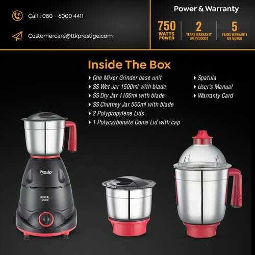 The Prestige 750W Regal Mixer Grinder is designed to provide efficient grinding and blending for your kitchen needs. Equipped with a powerful 750-watt motor, this mixer grinder ensures smooth and quick performance with 22,000 RPM, making it ideal for grinding tough ingredients. It features three high-quality stainless steel jars: a 1500ml wet jar, 1100ml dry jar, and 500ml chutney jar, all equipped with durable blades. The elegant red and black design enhances its aesthetic appeal, while the sturdy handles provide a comfortable and secure grip for easy use. It also comes with a 2-year product warranty and 5-year motor warranty, ensuring long-lasting reliability. The mixer grinder is packaged with essential accessories, including polypropylene lids, a polycarbonate dome lid with cap, spatula, and user manual, making it a complete and convenient appliance for your kitchen.