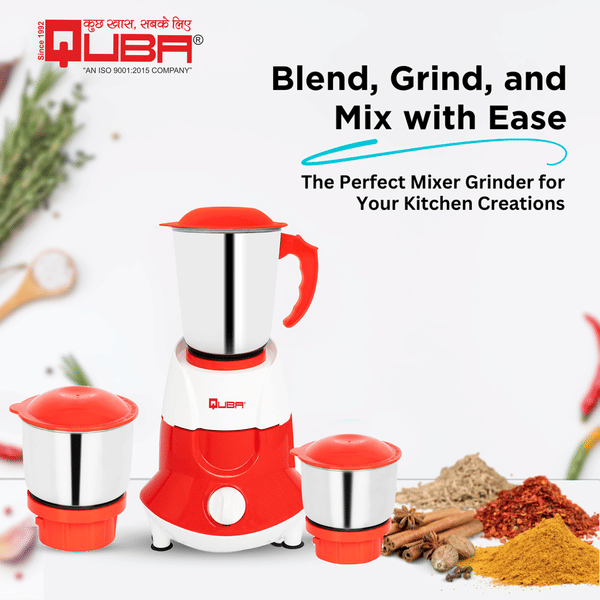 Everyday mixing and grinding in the kitchen becomes easier with QUBA mixer grinder MG 201 & 1000watt Dry Iron that serves the best in grinding chutneys, spices and other preparatory ingredients. This mixer grinder has a powerful motor of 550 W that makes it an efficient machine. Easy to use, this mixer grinder has smart features like pulse, over lade protection and speed regulation. This mixer grinder comes with two versatile Stainless Steal jars fitted with super sharp blades to facilitate liquidizing, blending and grinding. Package Includes - 550 Watts Mixer Grinder Motor Unit With Operating Voltage: 230 Volts 50Hz, 1 Big jar with lid, 1 Medium jar 1 Chutney jar with Lid, 1 Mixer Unit, & Dry Iron 1 User manual with Warranty Card.