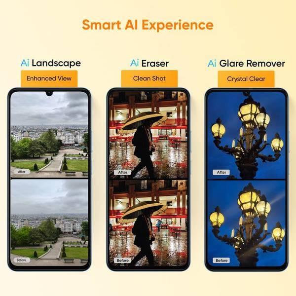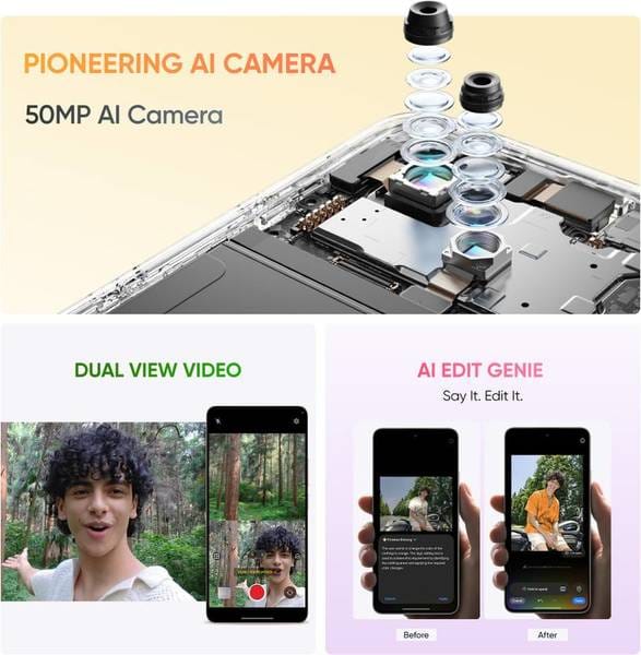- Rear Camera Features: 50MP main + 8MP ultra-wide rear cameras with features like Night, Portrait, Slo-Mo, Pro mode, Dual View, Timelapse, Scan, and Live Photos support.